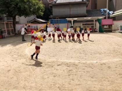 もも組・ばら組・ゆり組が混ざって、リレーもしています。トラックの外側を走ることやバトンを繋ぐ大切さを遊びの中で教えてもらっていますが、何よりいろいろなクラスの友達と遊ぶ楽しさを感じているようでした。