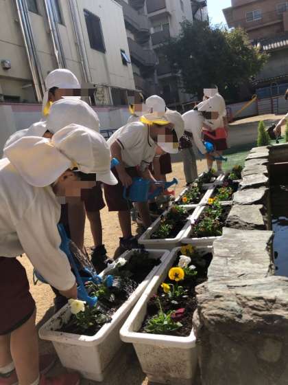 花苗を植える経験を積み重ねてきているので、「ビオラかな?」「パンジーかな?」と、自分たちで見分けて選びました。並べ終えると茎が折れないように、そーっとポットから花苗を出します。この力加減が難しいのですが、これまでの経験を生かしていましたよ。