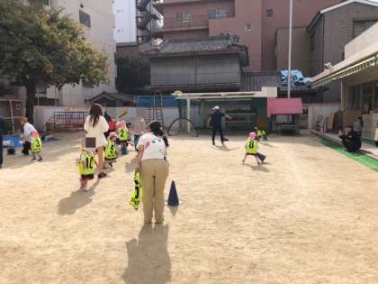 まずはウォーミングアップで、子どもたちがどんどん三角コーンを倒していき、お家の人はそれを起こしていく競争です。もも組の俊敏な動きが際立ち、子どもたちの2連勝!!