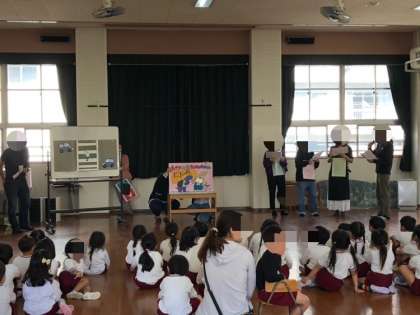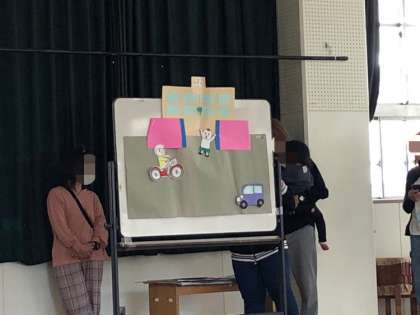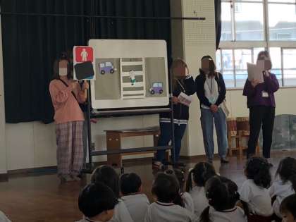 先日、PTAの地域委員さんが交通安全指導をしてくださいました。「道路を飛び出さない」「信号を守って渡る」などを紙芝居やホワイトボードを使ってイメージしやすいようお話をしてくださり、とってもわかりやすかったです。