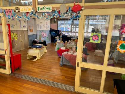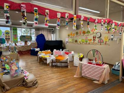 4歳児は、9月の海遊館への園外保育からずっと親しんできた海の生き物たちのイメージで作品づくりをしてきました。海遊館で見たチンアナゴ、マンボウ、タカアシガニなどなど、「これをつくりたい!」と思いをもって、たくさん考え、工夫してつくっていました。当日は、自分の作品だけではなく、「これは○○くんがつくってん。」と、友達の作品のことも、おうちの方に知らせている姿が見られました。