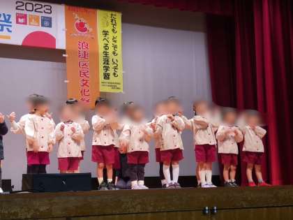 4年ぶりに、ゆり組が浪速区民文化祭に出演しました。日東幼稚園の5歳児と一緒に舞台の上で素敵な歌声を披露しました。お客様に拍手をたくさんもらって、歌う気持ちよさを味わい、満足した表情で手を振っていました。