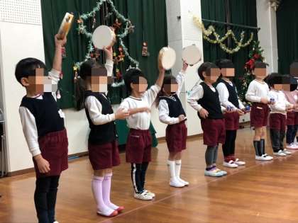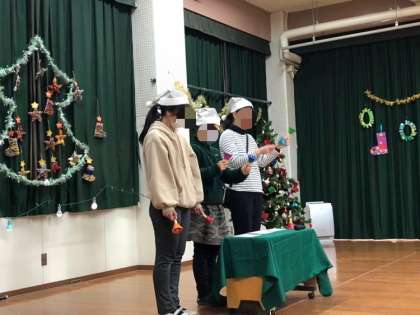 「来てくれるかなぁ…?」と、みんなで遊戯室に集まって、クラスごとに歌や楽器遊びをしたり、先生がハンドベルのきれいな音色を聞かせてくれたりしました。みんなの歌声や楽器遊びが聞こえたからか、サンタさんがやって来てくれました!!