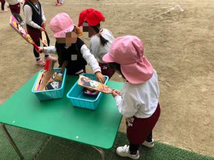「どうやって遊ぶんだった?」「こうやってたよ!」と子ども同士で教え合ったり、先生が2人で羽根つきを披露したので、「一緒にしようよ!」と他のクラスの友達とも遊ぶ姿が見られたりしました。