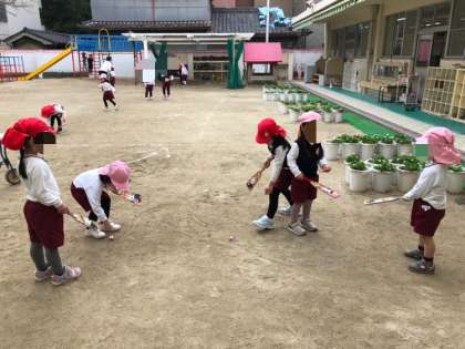 始業式で先生が教えてくれた「羽根つき」に早速、挑戦していました!