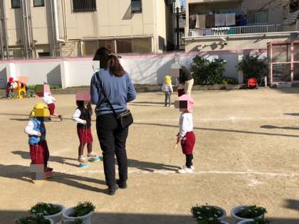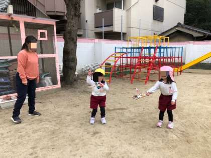 先生に見てもらいながら羽根つきに挑戦です。羽根をよく見ていることや「板に当たったね〜!」と見守ってもらうことで何度も繰り返して遊んでいましたよ。やってみようとしている時に、そういった姿を認めたり励ましたりしてくれる先生の存在があって、後の根気強さに繋がっていきます。他のクラスやみんなの先生の存在も大きいようです。