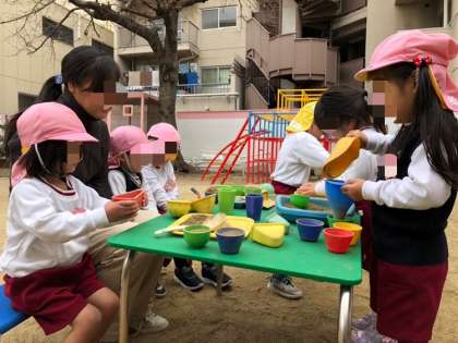 ごっこ遊びが楽しくてごちそうをつくったり、先生や友達に食べてもらうことを楽しんでいました。「キャンディー屋さんです〜♪」などとっても楽しそうに見立てて遊んでいましたよ!