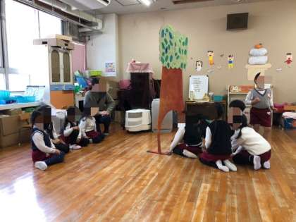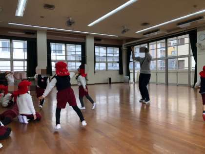 ある日は先生と一緒に体を大きく動かして遊べるように、遊戯室で遊びました♪またある日は、子ども同士でそれぞれの登場人物になって遊びました。先生は一緒にその登場人物になったり見守ったりしながら遊んでいます。