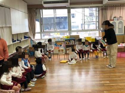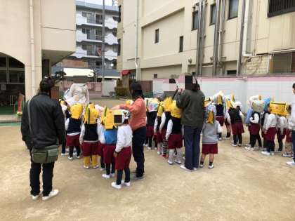 この1年で、火災、地震、津波、不審者侵入などいろいろな想定で避難訓練を実施してきました。もも組の子どもたちは繰り返し避難訓練を経験することで、「自分の命を守る方法」を知って参加するようになってきました。ばら組・ゆり組は先生の指示を聞いて、落ち着いて避難していましたよ。実施後は各クラスで避難訓練を振り返っています。