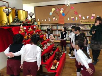 毎年この時期には飾って、子どもたちに飾り道具や三人官女、五人囃子などについて知らせています。ゆり組はもも組、ばら組の時にも知らせているので思い出しながら飾っていましたよ♪