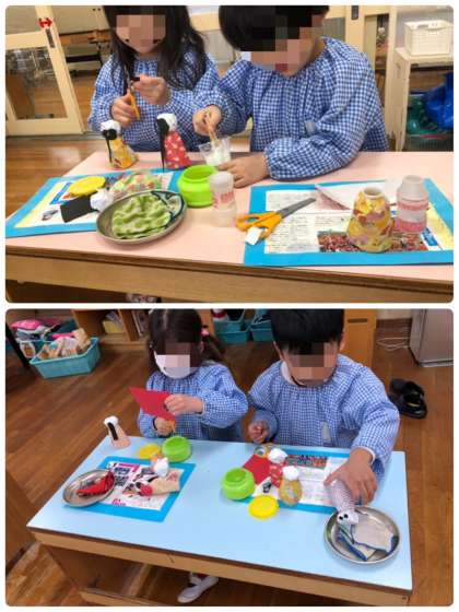 1日では到底つくることはできず、子どもたちが集中できる時間内で何日もかけてつくっています。三人官女の結われた髪をつくっている子どももいました♪土台にあった大きさになるように、微調整しながらつくる姿はさすが年長組です。とっても集中していましたよ。