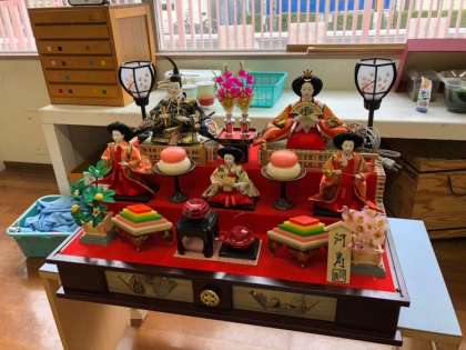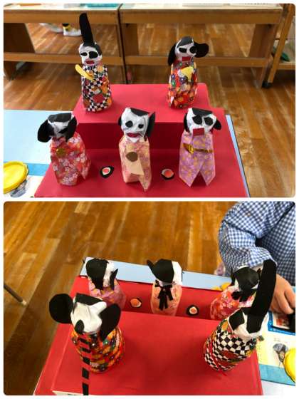 ゆり組は年長組なので、少し難しい立体の雛飾りをつくっています。今年度は二段飾りです♪
