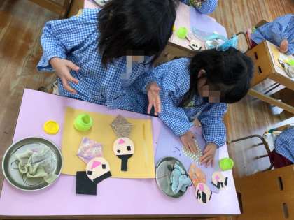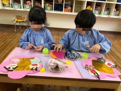 色画用紙を切り貼りして女雛と男雛の顔をつくりました。ハサミの扱い方にも随分慣れてきましたが、3歳児は生まれ月や経験などで個人差が大きいです。製作に使用する素材は扱いやすく、子どもたちが集中できる活動内容になるように配慮して、何日かに分けてつくるようにしています。
