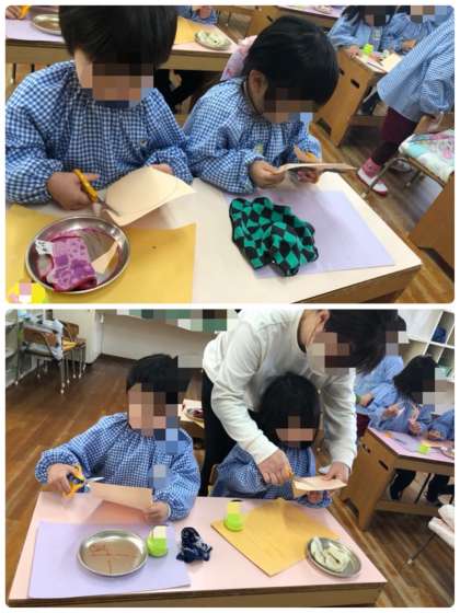 切りやすいように先生がかいてくれた丸の線に沿って輪郭を切りました♪ハサミを開いたり閉じたりするのに苦戦している時は、先生が少しお手伝いをしました。
