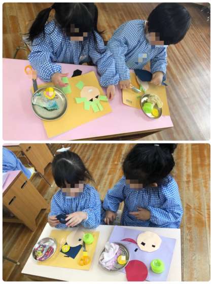 「髪の毛や目、口は何色にしようかな?」と、それぞれに必要な色画用紙を切り貼りしてつくりましたよ。貼り合わせる時の、糊の量も調節する姿が見られました。