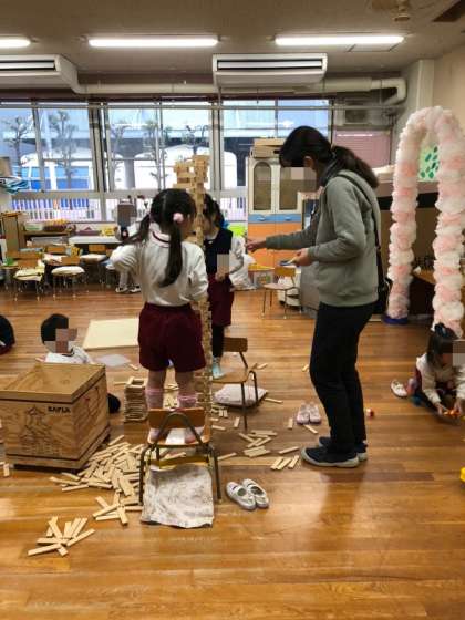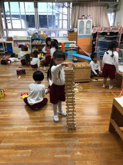 ばら組では2人で積んでいたのと4歳児ということもあり、椅子を台にしないと届かないくらいの高さになっていました!もも組では、1人でしたがコツコツ積み上げていました。縦横の幅などを丁寧に積んでいかないとバランスが崩れていくので、根気が必要で指先をよく使った遊びです♪