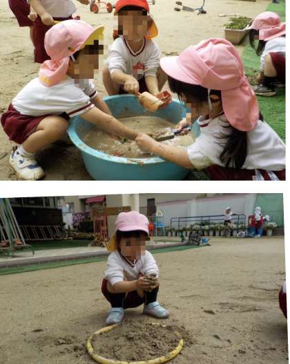 雨の後、園庭の土が少しぬかるんでいるところがあり、それに気づいたもも組。そこからどろんこ遊びが始まりました。水やり用に置いていたタライの水も使って遊び始め、みるみるうちに手足がどろんこに♪