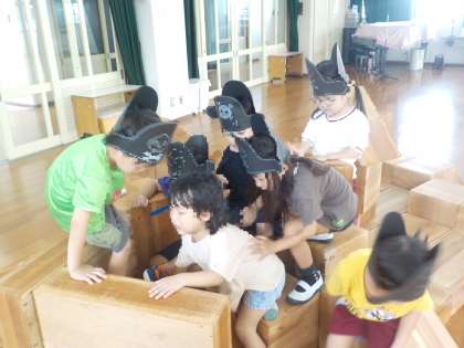 大きな積み木を沢山運んで、全員が乗れる海賊船をつくりました🚢