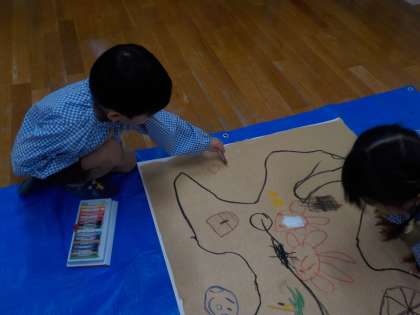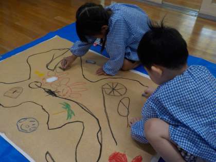 どんな宝島だろう? 公開日 2025/09/04 更新日 2025/09/04 子どもたちの様子 大きな画用紙に、宝島の地図をかきました。 「宝島には何があるだろう?」「海にはタコがいるんだよ」 海賊が大好きになった子どもたちは、想像力を働かせながらのびのびと絵をかいていました。発想力豊かな姿が見られ、絵の中で探検していましたよ。 いいね(0)