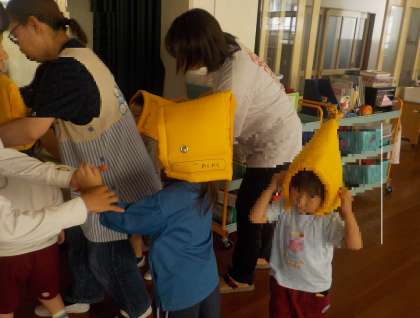 預かり保育避難訓練 公開日 2025/09/08 更新日 2025/09/08 子どもたちの様子 預かり保育中に地震が起きた想定で、避難訓練を行いました。 保育室から担任と避難するのとは少し違って、2階の遊戯室から預かり保育の先生と避難します。 防災頭巾も預かり保育用に、遊戯室に置いてあります。 子どもたちは落ち着いて上手に避難していました!階段も上手に降りていましたよ。 災害はいつ起こるか分かりません。おうちでもお話してみてくださいね♪ いいね(0)