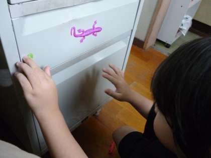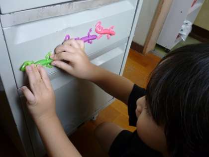 おもちゃのトカゲ、いろいろなところにピタッとくっつくので、