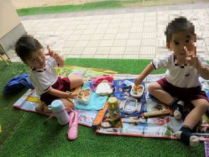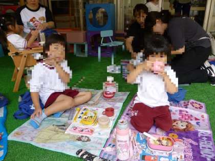 今日は、遠足みたいにシートを敷いて、テラスでお弁当を食べてみました☆