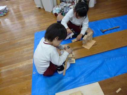 ♪とんとんとん♪ 公開日 2025/11/13 更新日 2025/11/13 子どもたちの様子 ♪とんとんとん♪ いい音が幼稚園に響いています ぎこちなかった音が 心地よいリズムになってきました なんのおとでしょう?? ゆり組の子どもたちが木工遊びをしていましたよ リズミカルに 釘を打つのが上手になってきたようです♪ 釘を打つ、手の使い方、力の入れ方、集中力 たくさんのことが育ちますね 子どもたちの真剣な姿から、成長を感じます いいね(0)