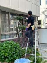 園庭の植木を剪定している主事さんの様子に興味津々のこどもたち。植木もチョキチョキ...