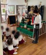 ばら組が、五月人形をみんなで眺めています。これは何かな、分かりやすく担任の先生が...
