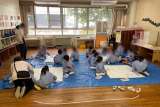 もも組が大きな紙にクレパスで、ぐるぐるぐるぐる〜と力いっぱい描きました! お友達...