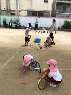 未就園児と保護者の方が、幼稚園のお庭に遊びに来てくれました。 もも組が一緒にお片...