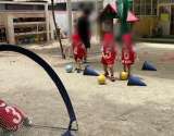 もも組も、サッカーが大好きで、コーチに元気よく挨拶してスタート。鬼ごっこで体を動...