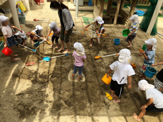 ゆり組が砂場で穴を掘ったり山をつくったりしていました。穴と穴を繋げて道が出来まし...