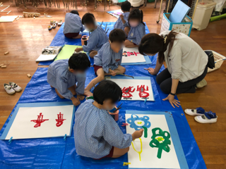 ばら組は手に絵の具をつけて、紙にペタペタペタ…。「何色にしようかな?」と色を選ん...