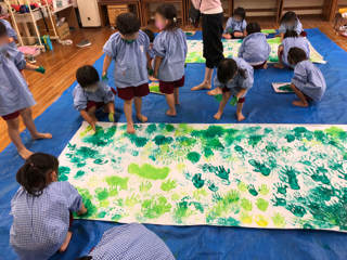もも組は大きな大〜きな紙に、黄・黄緑・緑の絵の具で手型をペタペタペタ。 小さな手...