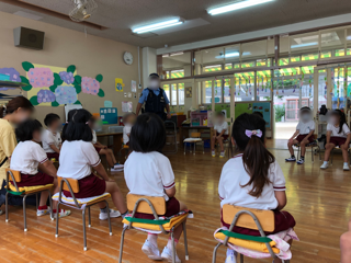 浪速警察の方が幼稚園に来てくださいました。 腰についている棒は何かな?どうして手...
