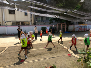 体を慣らす鬼ごっこでは、お互いに声をかけ合い、鬼から逃げながら仲間を助けていまし...