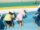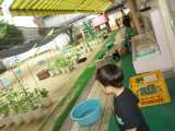 もうすぐプール遊びが始まります ゆり組さんが、雑巾と水鉄砲もって屋上のプールに...