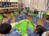 もも組さんが絵の具で遊んでいました ぺたぺた絵の具 触るのに少し勇気がいる...