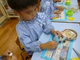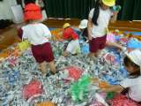 雨でプールもお休みの日。 もも組がブドウをつくっていました。 お花紙をくしゅく...