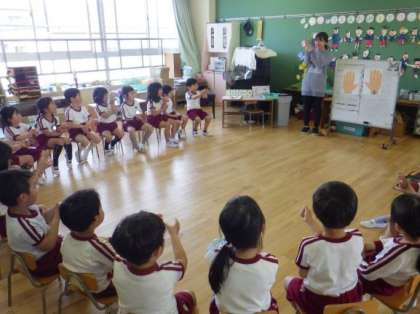 どうして手を洗うのか、どんな時に手を洗うのか知らせたり、正しい洗い方を練習しました。