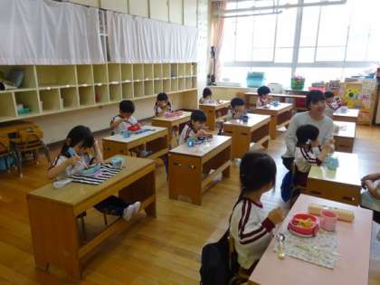 今日、3歳児は初めてのお弁当でした。準備は5歳児が手伝ってくれました。沢山の人と食べることが初めてであったり、家とは違う雰囲気の中で食べることに緊張したりと一人一人違う姿が見られました。みんなで食べる楽しさを感じることができるようにと考えています。おうちの皆さんもどんなお弁当にしようかと考えていただいたかと思います。ありがとうございます。