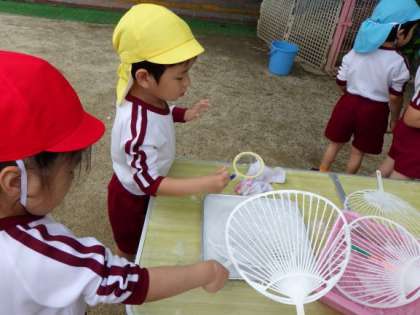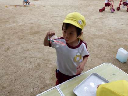 シャボン玉できるかな? 公開日 2024/05/09 更新日 2024/05/09 保育の様子 日差しが温かくなり、幼稚園ではシャボン玉で遊んでいます。シャボン玉液を丸い枠やうちわの骨につけて、振ったり吹いたりするとまーるいシャボン玉ができます。その力加減や吹き加減が難しく、子どもたちは何度も繰り返し、そーっと吹いたり、揺らしたりして試しています。子どもたちが主体的に試して遊ぶ姿を大切にしていきたいと思っています。 いいね(0)