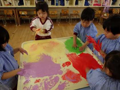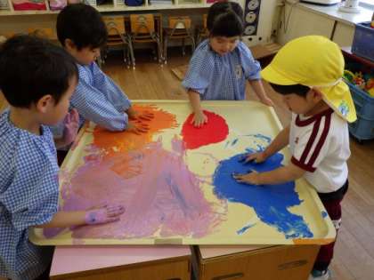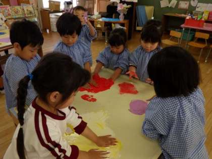 4歳児ほし組は指絵の具で遊びました。いつもは筆を使っている絵の具を今日は指や手を使ってかいたり塗ったりしました。絵の具を指や手で塗り広げていく感触の心地よさや、指で線をかいたものを紙に写し取る面白さを感じて遊びました。いろいろな感触遊びや、表現遊びを楽しんでいきたいと思っています。