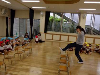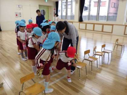 来週子どもたちは電車に乗って園外保育に出かけます。今日は電車に乗る時の約束を先生が見本をしたり、絵を見たりしながら知らせました。電車の乗り降りする時にはしっかり足元を見て隙間に落ちないようにすること、電車内では静かにすること、電車の扉には寄りかからないことなど子どもたちは真剣に話を聞いていました。遊戯室につくった電車にしっかり足を上げて乗ったり降りたりみんな上手にできていました。みんなで園外保育に行くのが、楽しみですね!