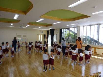 遊戯室で初めての誕生会をしました。誕生児がチョウチョウと一緒に散歩をしたり、全員でふれあい遊びをしたりしました。誕生会を通してひとつ大きくなる喜びを感じたり、友達をお祝いしたりする気持ちを育んでいきたいと考えています。