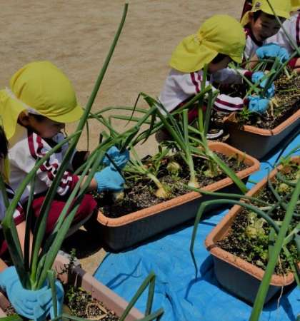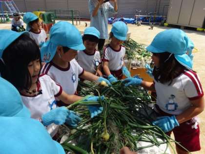 4歳児と5歳児がタマネギを抜きました。「タマネギのにおいする」と友達と話をしながら抜いていました。5歳児はネギボウズに気付き、根の長さや大きさにも興味をもっていました。スーパーなどでは、根がついておらずネットに入れて売られていることも多いです。実際に育てて収穫することで気付くことも多くあります。実体験を大切に保育を進めていきたいと思います。
