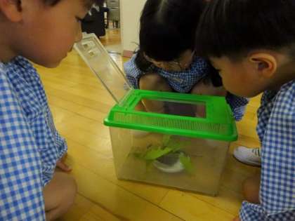 3歳児がチョウチョウの幼虫をじっと見て「葉っぱいっぱい食べてる」と話していました。一緒に見ていると「目かわいいな」なども感じていました。身近な環境にいる虫や生き物にふれることで、命の大切さを感じることができるようにしていきたいと思います。