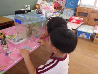 幼稚園で飼育していたアオムシがチョウチョになっていました。朝から子どもたちが見つけ「先生!チョウチョいるよ!」と驚いていました。飼育ケースの中にいるアゲハチョウを見ながら「先生、チョウチョこの中に入れたん?」と言う子どもたち。サナギからチョウが出てくることを子どもたちは知らなかったようです。「サナギからチョウチョが出てきたんだよ!」と知らせると、どのサナギから出てきたんだろう?と子どもたちは探していました。