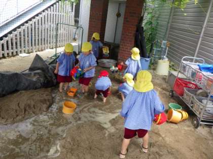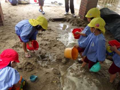 砂場にたらいを置いて水をためました。先週5歳児が砂場に穴を掘り、温泉だよ!と教えてくれたのを子どもたちは覚えていて、今日はほし組とはな組の子どもたちが砂場に水を流したり、ためたりして遊びました。「楽しいね!」子どもたちは水や泥んこの感触を存分に味わい楽しんでいました。5歳児の遊びに4歳児3歳児の子どもたちは刺激を受けて、やってみたい!楽しそう!と感じています。またそら組さん、楽しい遊びを教えてね。